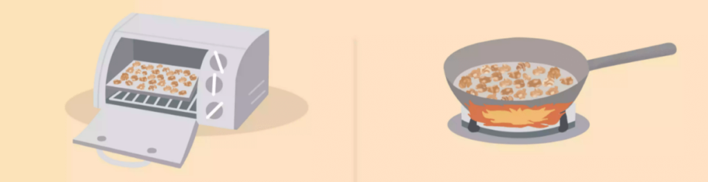 Чистка грецкого ореха возможна и без кипятка. Вместо этого плоды помещаются на листе в духовку примерно на десять минут, что также существенно облегчает процесс их чистки.