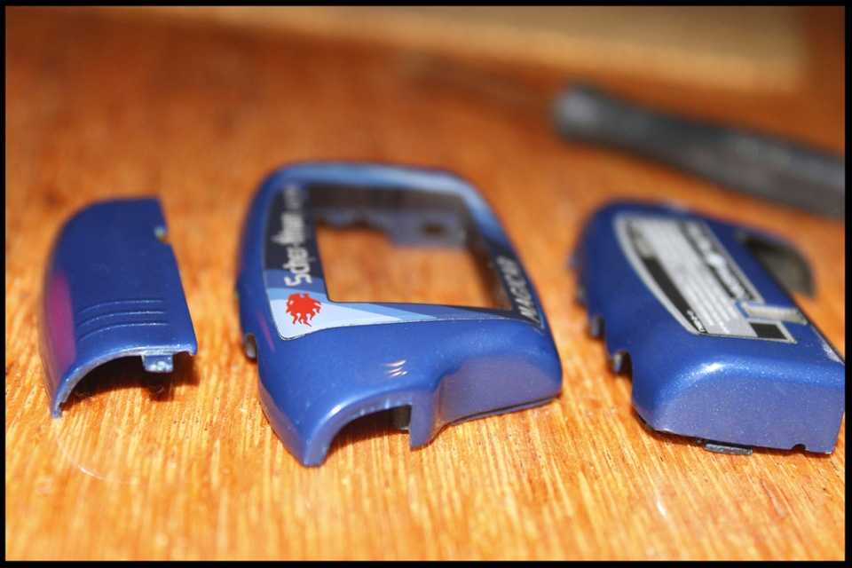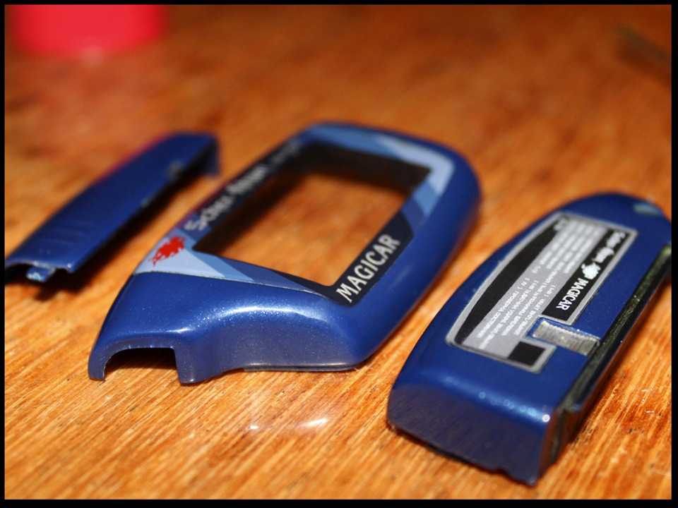 Брелок достался мне вместе с ключами, после 2-х летнего пользования им. И естественно он был весь пошарпан об рулевую колонку и контакт с внешним миром ). Глядя на заюзанный и поцарапанный брелок, пол года назад перекрасил корпус в черный цвет, но со стеклом так и остались проблемы. Само стеклышко было покрыто изначально производителем лаком, который повсеместно облез.Вот в таком виде был до обработки мой брелок от сигнализации.