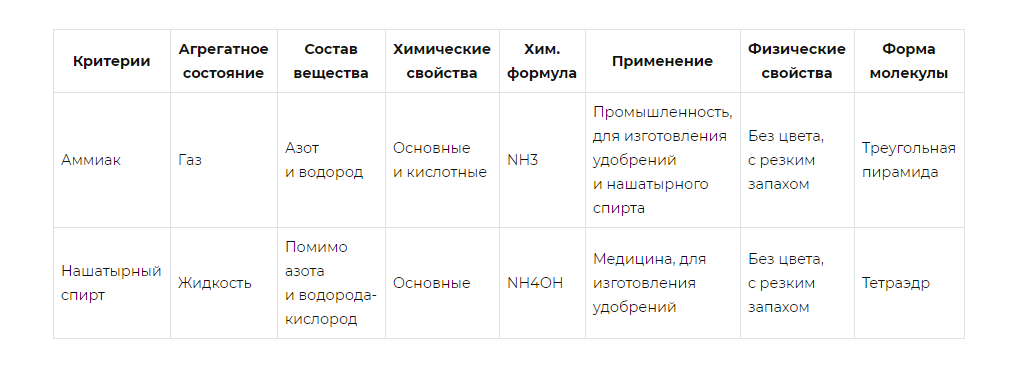 Также помочь разобраться в разнице между нашатырем и аммиаком может следующая вспомогательная табличка данных: