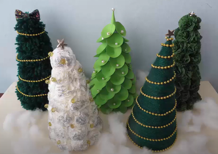Для елки среднего размера понадобится конус – основание. Его можно свернуть и склеить из картона и плотно набить бумагой, либо сделать такой конус из пенопласта. Для устойчивости конструкции основу под елку можно приклеить к картонному или фанерному кругу, большему по диаметру, чем нижняя часть конуса. Когда основа под елку будет готова, то можно приступать к наклейке на нее деталей кругами, по направлению снизу — вверх. В нижней части поделки можно разместить детали побольше, к верхушке их размер можно постепенно уменьшать. После полного высыхания изделия, его украшают ватой, покрывают серебристым лаком, вешают бусы или гирлянды. К лапкам можно приклеить свалянные из шерсти разноцветные шарики.