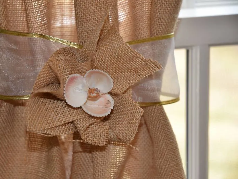 Крупный цветок хорошо смотрится на материи, текстура которой немного грубая. При этом основу достаточно просто вырезать из нее, без обметки, и завязать вокруг шторы.