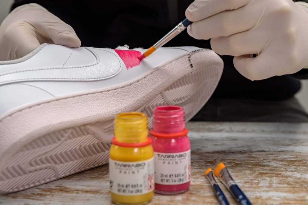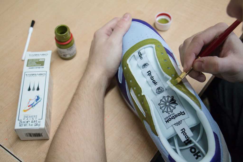 На кроссовки краска наносится щёточкой, кистью или губкой, исходя из материала, из которого изготовлена обувь и вида краски.