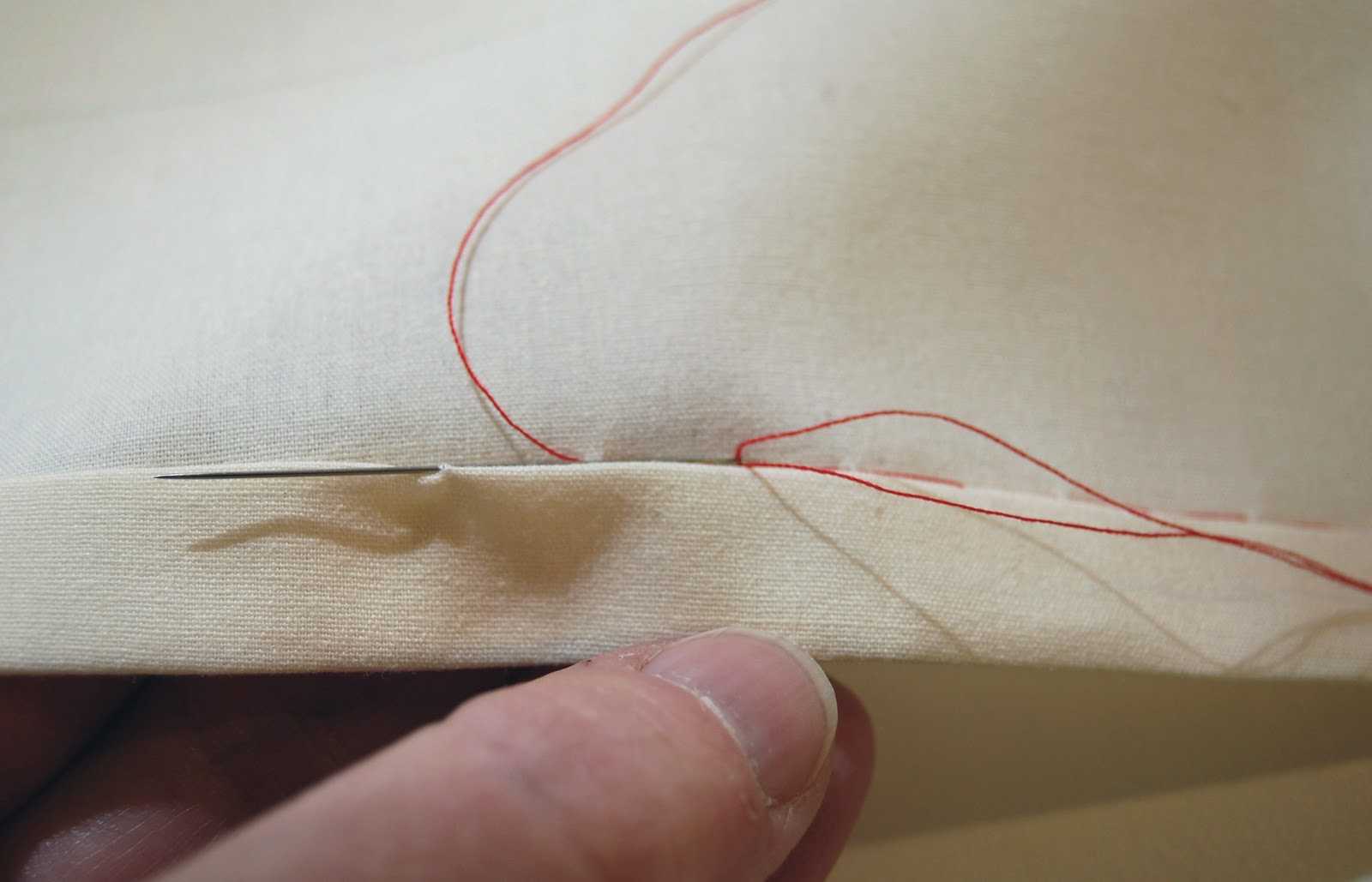 Проведите иглу через подогнутый край верхней ткани. Захватите одну нить нижней ткани и снова введите иглу в сгиб верхней ткани.