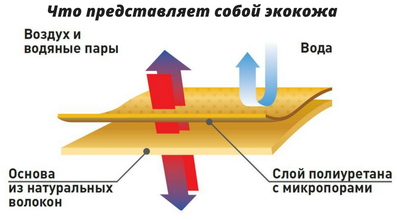 - проницаемость воздуха и паров: экокожа не препятствует вентиляции организма, тело не потеет;