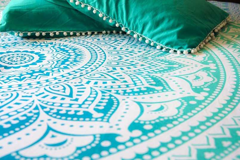 При хорошем освещении, общей теплоте позволительно проявить большую фантазию в выборе цвета покрывала.