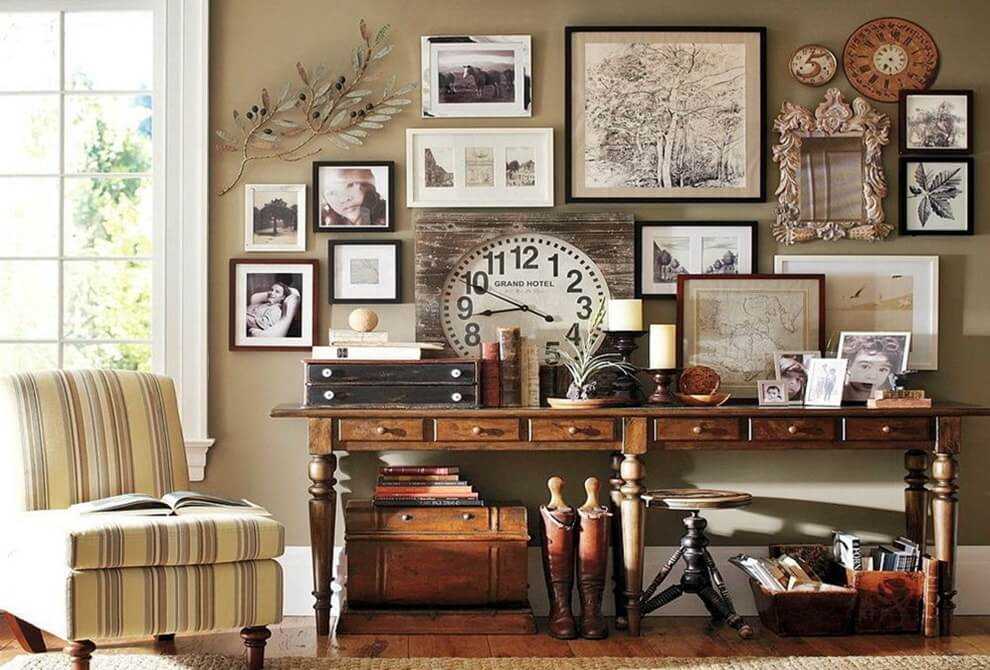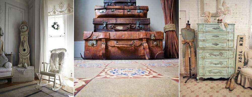 Оформление комнаты в стиле винтаж будет неполным без использования декоративных элементов. Они должны быть тщательно подобраны, чтобы не допустить ощущения выставки или просто захламлённости пространства. Наиболее распространённые предметы, соответствующие винтажному стилю: старинные часы; резные шкатулки; фарфоровая посуда; оригинальные подсвечники; расшитые скатерти; вязаные салфетки; нежные шторки с вышивкой ришелье; тряпичные куклы; медные статуэтки; чёрно-белые фотографии в рамках.