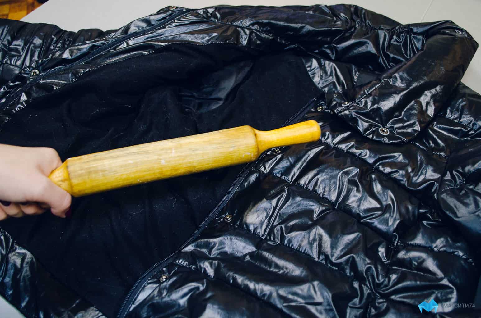 - Уложите куртку на горизонтальной поверхности, подложив под низ махровое полотенце или сложенную в несколько слоев простынь.