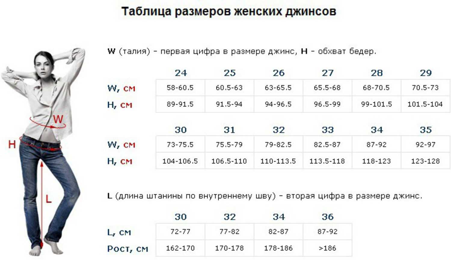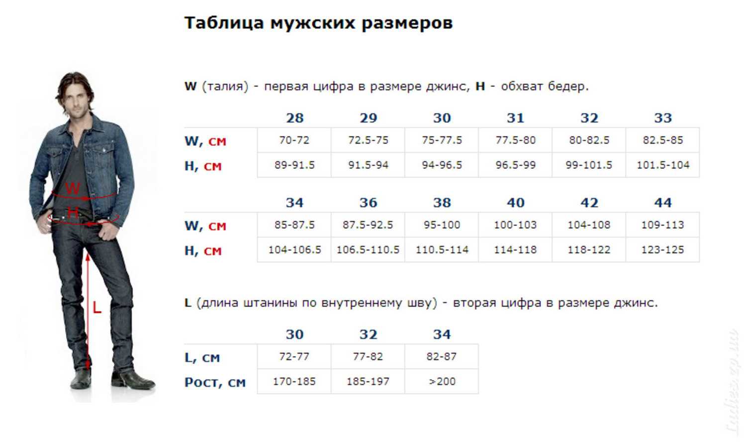 Если же вы выбрали отечественного производителя одежды, то размерная сетка мужских джинсов будет стандартная, рассчитанная на мужчин средней комплекции и роста. Ниже приведена таблица российских размеров джинсов для мужчин.