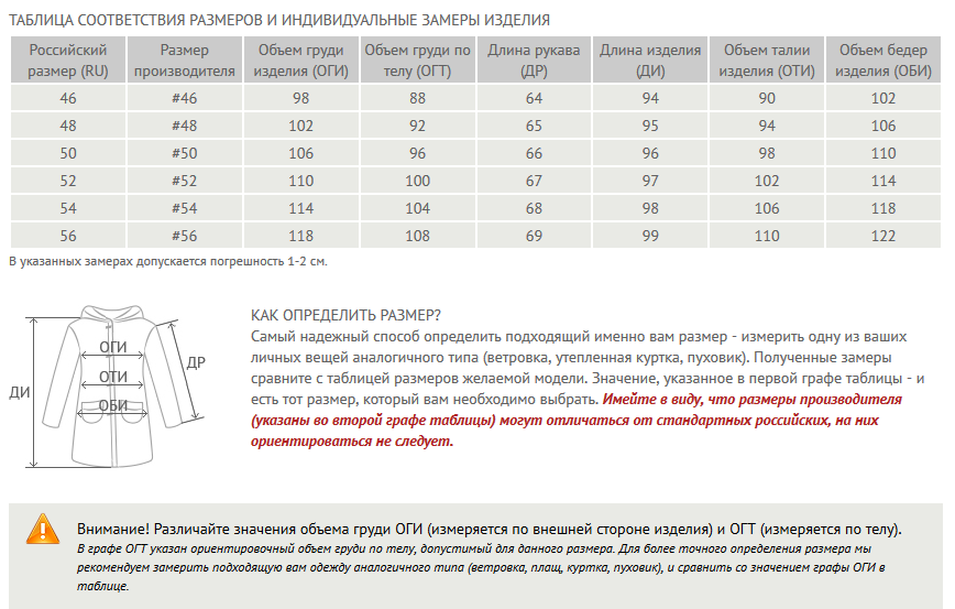 На этикетке изделия может быть указана различная маркировка – в зависимости от страны-производителя. Ниже приведена таблица соответствия размеров и объемов, которая поможет тебе выбрать пуховик: