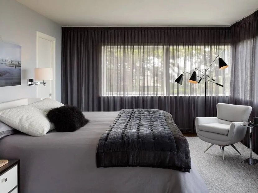 В интерьере этой спальни дизайнер отказался от использования портьер в пользу уплотненных льняных гардин из вуали. Они одновременно защищают комнату и от света, и от взглядов с улицы, а также позволяют создать ощущение безопасности и уюта в комнате. Глубокий серый цвет повторен и в обстановке (покрывало), отчего он смотрится гармонично и уместно.