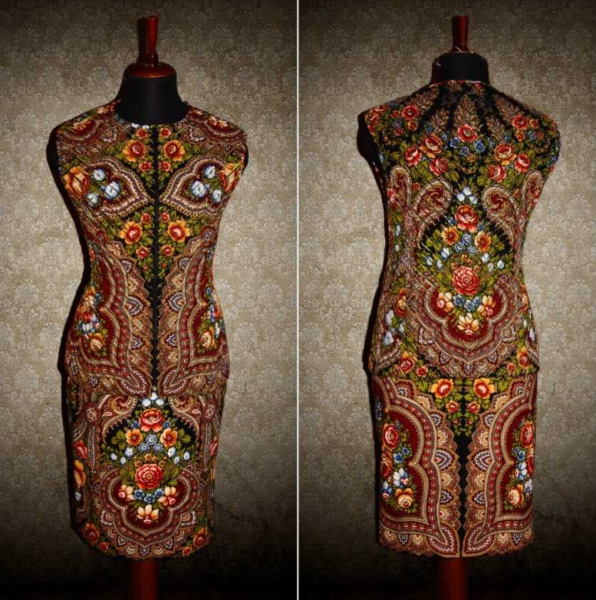 Необычно и красиво смотрится такая ткань в пошиве одежды.Совершенно потрясающий эффект получается, если в качестве верхнего слоя использовать павловопосадские платки.