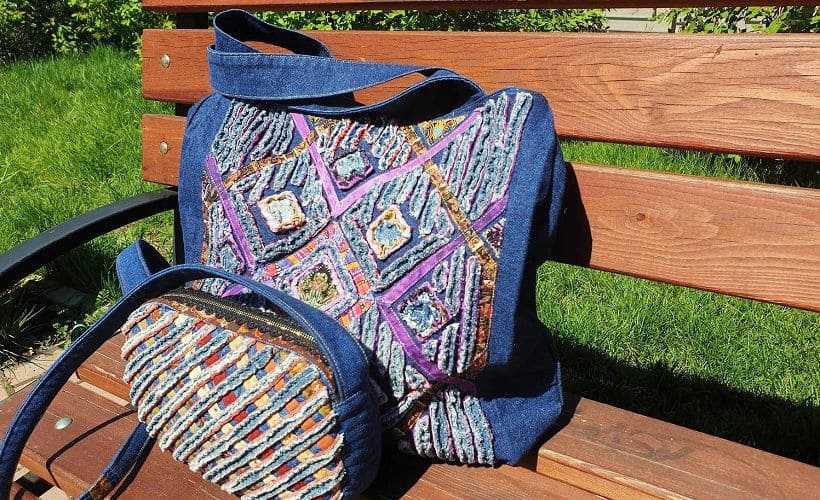 Синель подразумевает наложение нескольких слоев ткани, их простегивание на швейной машине под углом 45 градусов, разрезание верхних слоев. Затем эти срезы нужно активно размахрить.