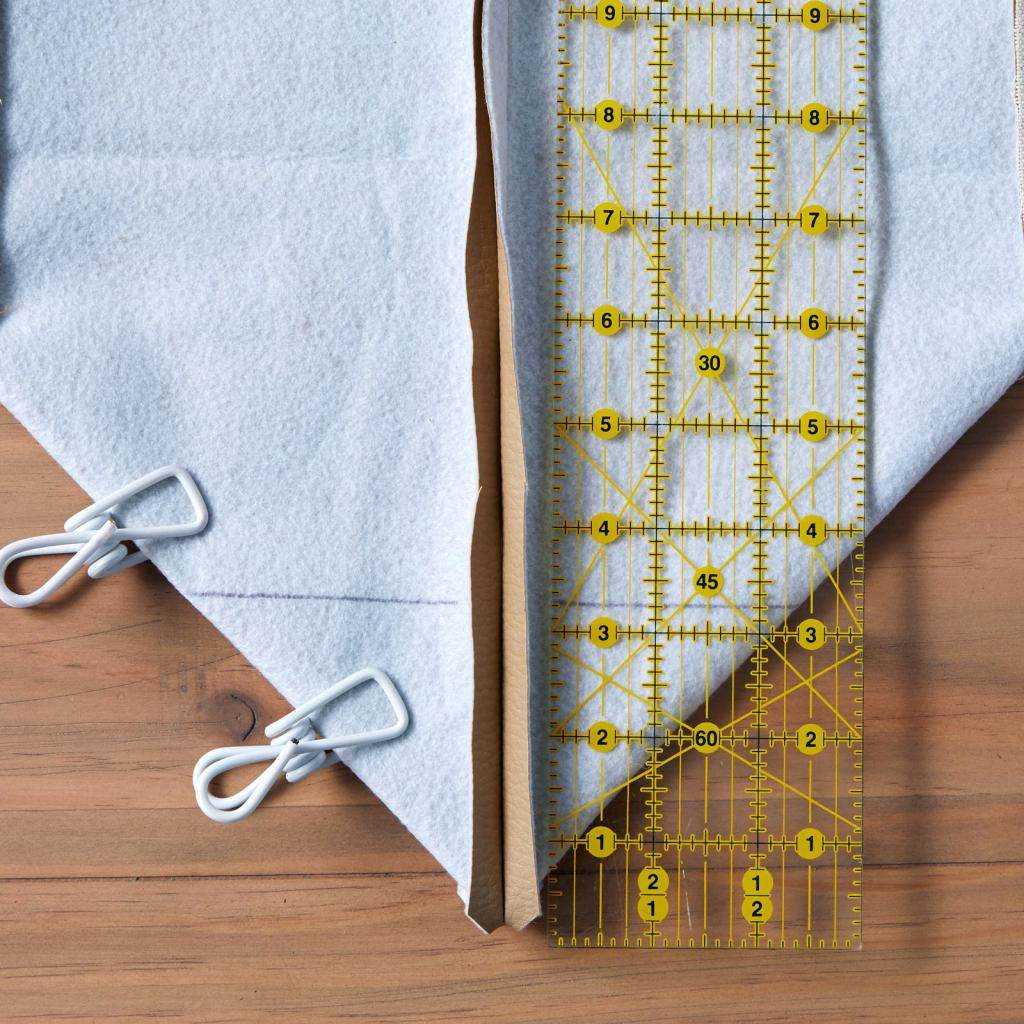 Расправьте дно сумки, отступите от угла несколько сантиметров по направлению к центру изделия, прочертите ровную линию, она ограничит треугольник.