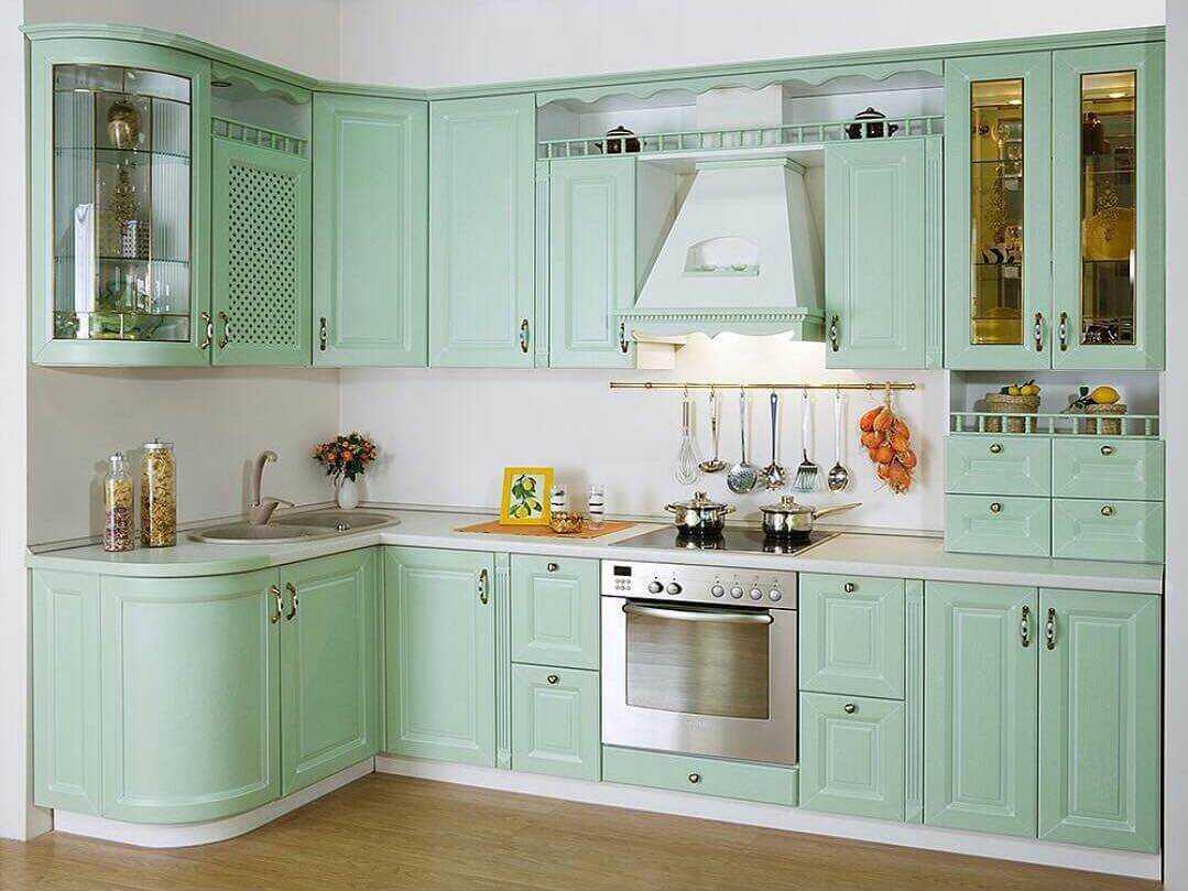 Дизайн кухни в стиле кантри, прованс либо классика нельзя представить без фисташкового. Он очень хорошо выглядит в сочетании с деревянной мебелью, естественными материалами и светлым текстилем, улучшает аппетит.