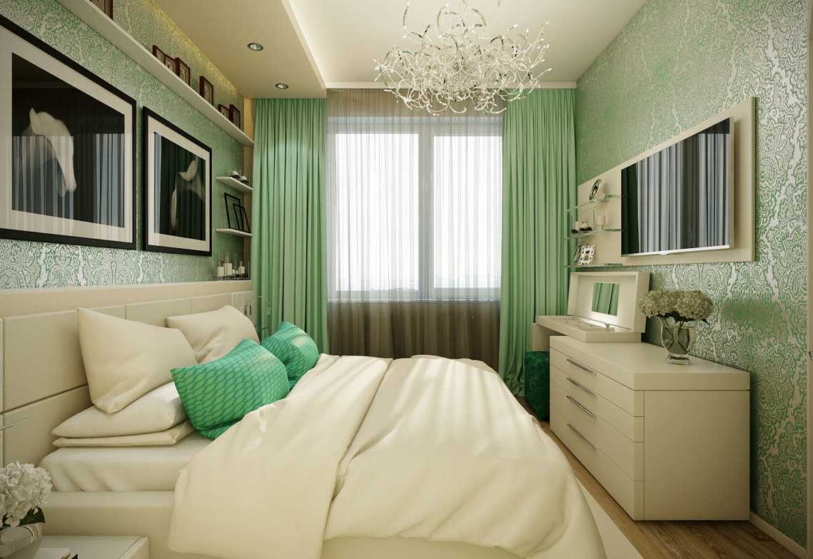 Применение разных оттенков фисташкового для стен, мебели и текстиля сделает из простой спальни комфортную комнату для отдыха. Сочетание светлого фона с фисташковыми шторами и покрывалами придаст этому помещению больше света и свежести.