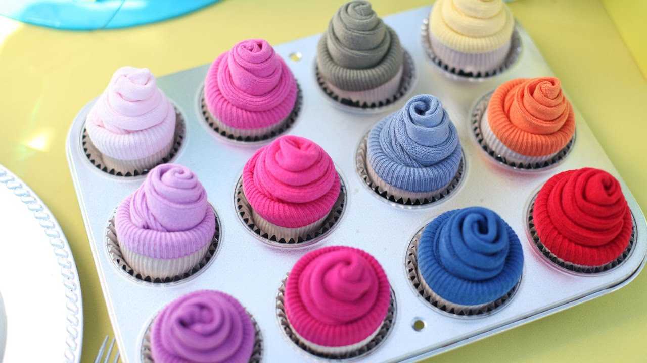 Мы уже рассматривали как складывать носки розочкой, формировать букет. Но это далеко не единственный прием удивить и порадовать человека. Одной из оригинальных идей может послужить свертка носков в стаканчике, как имитация пирожных. Как это сделать: