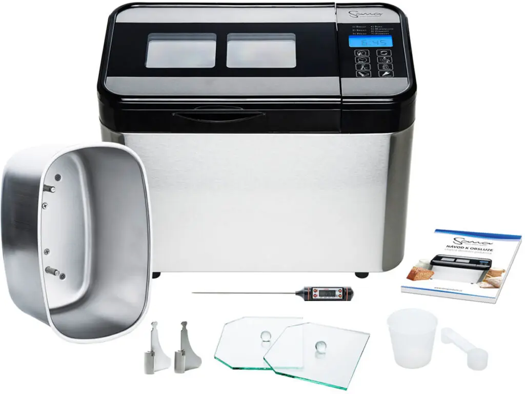 Хлебопечка Rommelsbacher BA 550 имеет 13 программ выпекания хлеба по разным рецептам, в том числе без глютена. Устройство замешивает тесто любой плотности, а в некоторых программах даже есть функция автоматического помешивания. Диспенсер у устройства автоматический, он сам добавит сыпучие ингредиенты в нужный момент. Смотровое окошко и дисплей с индикацией процессов позволяют контролировать процесс приготовления. У аппарата стильный дизайн в металлическом корпусе.