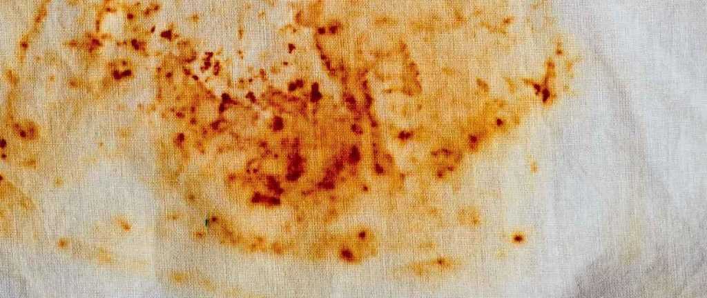 - Предварительно проверьте используемый растворитель на незаметном участке ткани. Так вы сможете убедиться, что он не испортит вещь, а будет воздействовать только на след от ржавчины.