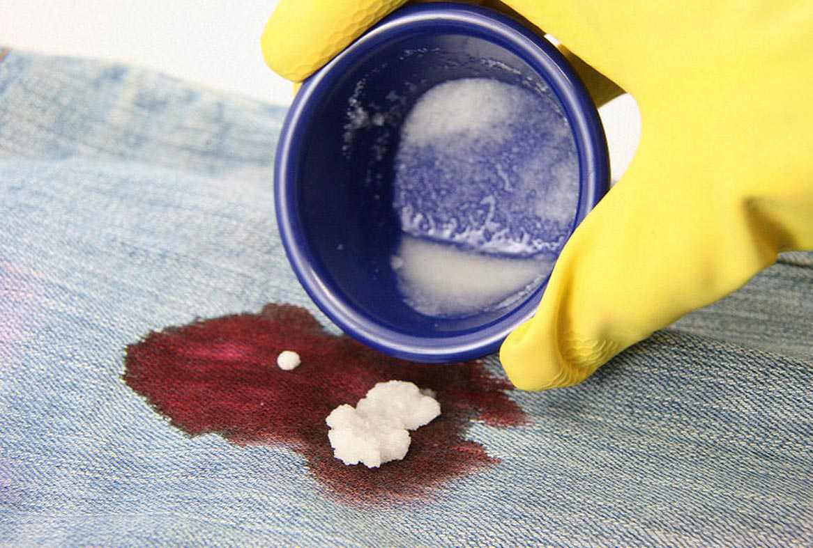 Соль является природным скрабом. Поэтому ее часто применяют для выведения таких загрязнений, как пятна от крови. Способ выведения: