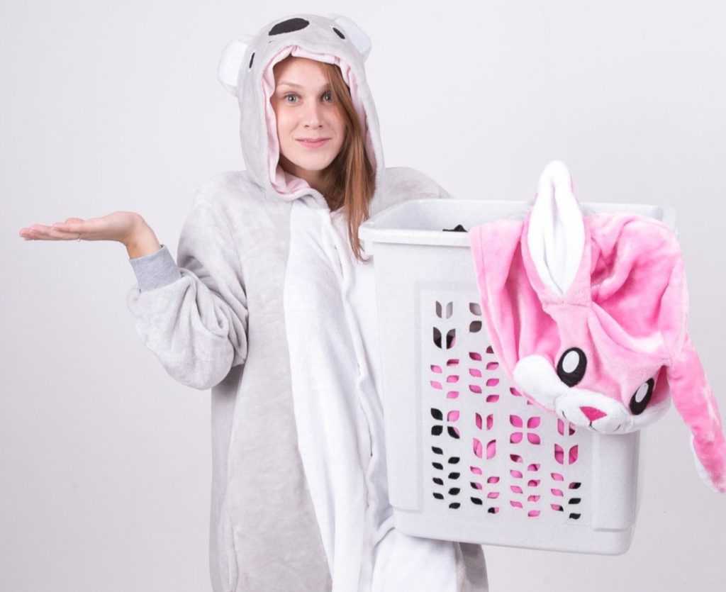 - Первым делом нужно тщательно проверить карманы кигуруми на наличие мелких предметов, чтобы они не повредили ткань. Также нужно полностью застегнуть костюм, и вывернуть его наизнанку.