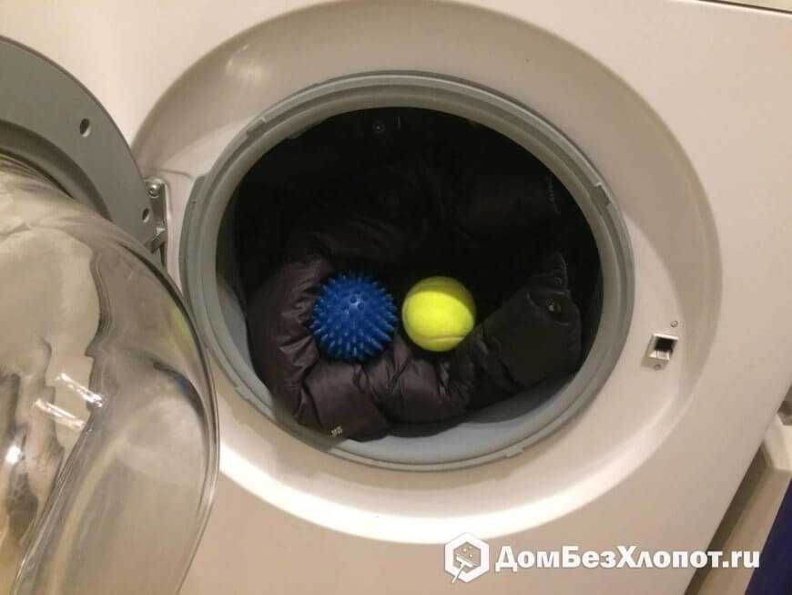 - Положите изделие в барабан, вместе с ним отправьте туда специальные шарики для стирки пуховиков (можно найти в любом гипермаркете) или теннисные мячики.